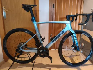 Bicicleta de carretera BH aerolight talla xl. Grupo 105 electrónico, luz trasera original acoplada a la tija, dos botelleros, cierre la ruedas aero. Cables internos. Manillar plano con potencia integrada. Pedales favero assioma duo con mismos km. Comprada en marzo de 2025. No tiene ni 300 km. Se vende por lesión. Factura de compra - Cuadro de carbono. - Frenos de disco. - Ruedas Vision Team 35.