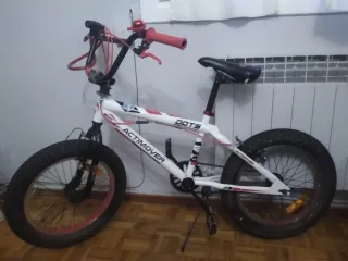 Bicicleta BMX de la marca Actimover, modelo Dots, en color blanco con detalles rojos. - Cuadro de BMX. - Ruedas anchas. - Manillar con puños rojos. - Incluye timbre rojo.