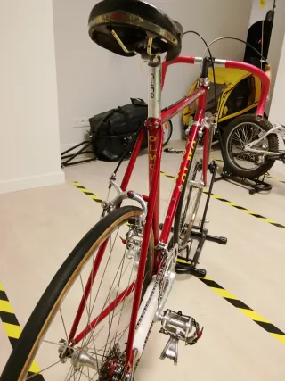 Bicicleta de carretera Olmo Competición en color rojo. Un clásico para los amantes del ciclismo. - Cuadro competición. Tubería columbus. Talla 54. - Llantas Mavic GP 4, bujes Mavic. - Manillar y potencia 3ttt. - Frenos super record 1°generacion. - Cambios, platos y bielas campagnolo nuevo record. - Tija campagnolo panto Olmo. - Sillín Rolls San Marco. - Pedales Gipiemme.