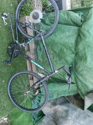 Bicicleta de montaña BTT, ideal para proyectos de reparación o para piezas. Tal como se ven las fotos las ruedas están desinfladas no existe eran pinchadas o no los frenos si funcionan bien los cables de los frenos también y como sube la foto le falta el sillín precio 7 o cambio por alguna cosa que me guste - Cuadro de bicicleta. - Ruedas de bicicleta. - Manillar de bicicleta. - Pedales de bicicleta.