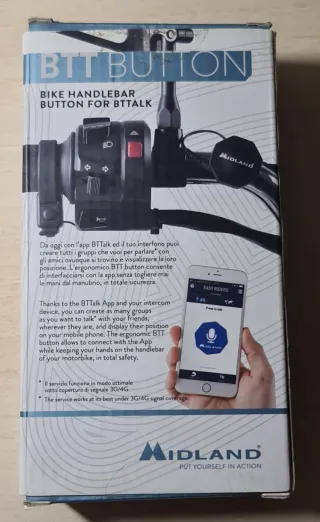 Botón para manillar de moto de la marca Midland, diseñado para usar con la aplicación BTTalk. - Resistente al agua. - Fácil de instalar. - Pulsación sencilla, presiona el botón inalámbrico y habla con el grupo permitiendo la comunicación mientras se conduce con total seguridad. - Se usa junto con la aplicación BTTalk lo que nos permite configurar a nuestro gusto. - Se instala muy facil en el manillar de la moto e incluso de la bicicleta y tiene una bateria que garantiza una duracion de 2 años, solo consume mientras se utiliza y entra en Stanby si no esta en uso. Hago envios.