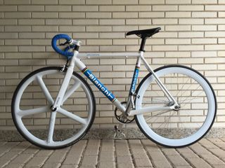 Bianchi Pista Dalmine . Fixie / Single Speed Color White/Blue Año 2013 Talla 49 Cuadro de Aluminio Horquilla: Bianchi Carbon Straight Aero Blade Alu/Carbon 11/8" Rueda delantera :Aerospoke carbono, cubierta Michelin Rueda trasera: llanta perfil Asiento: Selle Italia Q Bik Tija asiento: Easton Cycling Freno unico delantero: Promax Bielas: Truvativ TOURO Plato: Miche 46 Rastrales BLB Brick Lane Bikes blancos Potencia Deda Zero1 Manillar Deda RHM02 color blanco