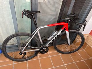 Bicicleta de carretera Trek Émonda SL5 con grupo Shimano 105 Di2. - Cuadro de carbono ligero. - Frenos de disco hidráulicos. - Color rojo y plateado. Manillar cambiado a Aleolus carbono Talla 56 Perfecto estado. Un pequeño arañazo y pequeño salto de pintura en la horquilla, parte inferior, donde el eje. Se ve en las fotos No se incluyen ni luces, ni gps, ni botella, ni pedales.