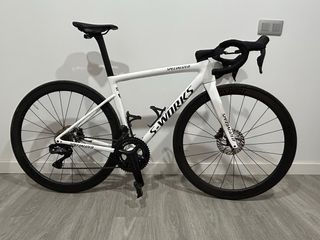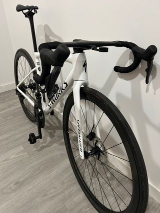 Bicicleta de carretera Specialized Tarmac SL8 en color blanco. Talla 52 Montada en shimano ultegra di2 12v Manillar integrado 420mm ancho, 100mm potencia. Ruedas roval 40mm carbono Dos tijas una de 380 y otra de 300 Bicicleta con solo 5 meses, no mas de 1000kms. Made in Taiwan.