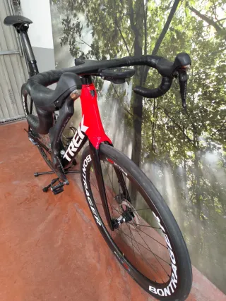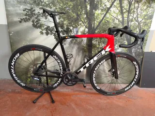 Bicicleta de carretera Trek Émonda con cuadro de carbono y componentes de alta gama. - Cuadro de carbono. - Ruedas de origen, si se quieren las de la foto, son hechas a la carta con buje ratchet dt swiss 350, radios sapim y aros perfil 45 (+500€) - Manillar integrado. - Sillín de carbono ultraligero 90gr. - Frenos de disco recién cambiados. - Porta bidones ligeros de carbono. - Patilla del cambio ultegra sobredimensionada. - Cadena dura-ace en buen estado. Se podría estudiar vender sin alguno de los componentes. La bici es una talla 60 (equivale aprox. Entre una talla L y XL), yo mido 1,87 y es una bici muy rígida pero con postura