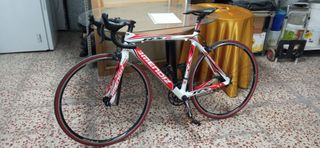 Bicicleta de carretera con cuadro de carbono. - Talla S. - Diseño en blanco y rojo. - Cuadro, bielas y manillar todo de carbono - platos 34/50, piñones 10(11/28) - frenos y cambios shimano ultegra - se ende por no usar, todo en perfecto estado Precio 650 euros, llamar al 658 447733