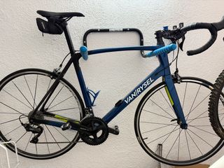 Bicicleta de carretera Van Rysel con cuadro de carbono. - Color azul y detalles en amarillo. - Manillar con cinta azul. - Incluye bidón - En perfecto estado.