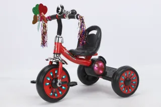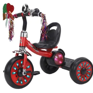 Triciclo infantil de tres ruedas en color rojo. Ideal para los más pequeños. - Diseño llamativo con luces LED en las ruedas. - Decoración con cintas y corazón en el manillar. - Asiento cómodo y seguro.