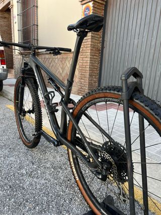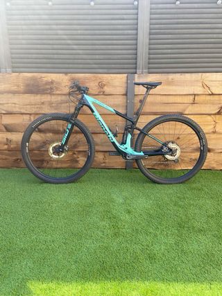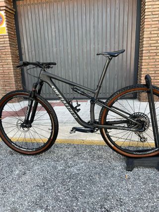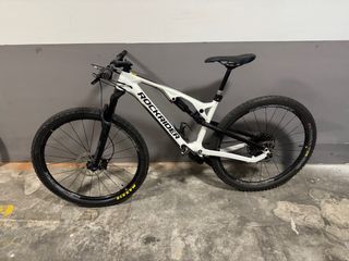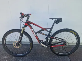 Bicicleta de montaña con doble suspensión. Carbono, frenos XT, ruedas dt Swiss XR 1700 cambio SRAM XX1, horquilla rock shox SID, amortiguador Rock Shox SID LUXE, tija y manillar de carbono. Cubierta trasera recien puesta, delantera en muy buen estado. Pedales XT.