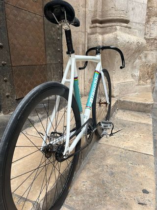 Bicicleta fixie / single speed montada sobre cuadro clásico de carretera Orbea talla 54 (1.70-1.80m). Ideal para ciudad. Características: - Ruedas de perfil alto negras - Configurable como piñón libre o fijo (actualmente libre) - Freno delantero y trasero con maneta - Neumáticos en buen estado - Sillín tipo araña Muy ligera, lista para rodar. Funciona perfectamente, solo tiene dos pequeños detalles estéticos: - Cinta del manillar algo desgastada - Leve sonido mecánico al pedalear que no afecta al funcionamiento La vendo porque ya no vivo en la ciudad y no la uso. Precio negociable