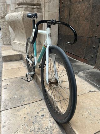 Bicicleta tipo fixie de la marca Fabric Bike. - Cuadro de aluminio - Horquilla de carbono - Manillar de carretera. - Ruedas Miche - Straps Cinelli - Manillares extras (cinelli y syncros)