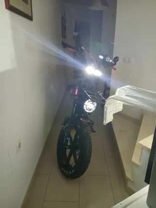 Bicicleta eléctrica tipo moto con ruedas anchas (fat bike). - Diseño robusto y llamativo. - Manillar con puños de colores. - Incluye cesta delantera y trasera. - Faros LED delanteros y traseros.
