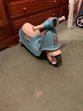 Moto de juguete estilo scooter, ideal para los más pequeños. Su diseño retro en tonos azul claro y beige la hace muy atractiva. - Ruedas de goma. - Manillar con puños. - Detalles decorativos con el número 01.