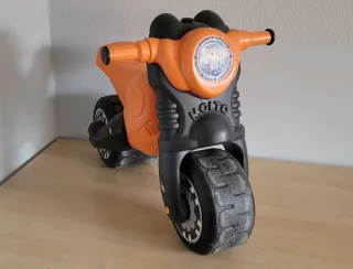 Moto de aprendizaje Molto de color naranja, ideal para que los más pequeños aprendan a mantener el equilibrio. - Diseño tipo moto. - Ruedas anchas para mayor estabilidad. Moto para aprender a montar en bici sin pedales y que se sostiene sola, bien conservada pero segunda mano le faltan las pegatinas, mirar fotos no tiene abolladuras y poco rastro de uso. Medidas máximas 70cm largo, 50 de alto y 40 de lado a lado del manillar