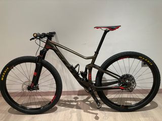 Bicicleta de montaña Scott Spark RC 900, ideal para competición. - Cuadro de carbono. - Ruedas de 29 pulgadas. - Suspensión delantera y trasera. - Frenos de disco hidráulicos. - Transmisión de alta gama. -Horquilla rock shox sidd 100 mm -Amortiguador trasero fox nude -Twinloc 3 posiciones -Grupo XTR 10-51, 12 velocidades -Frenos XT M8000 -Manillar carbono syncros 720mm -Bielas NEXT ( race face ) de carbono -Ruedas dt swiss X1700 Talla M Peso 10,500 KG Comprada nueva en 2020 Tengo factura de compra