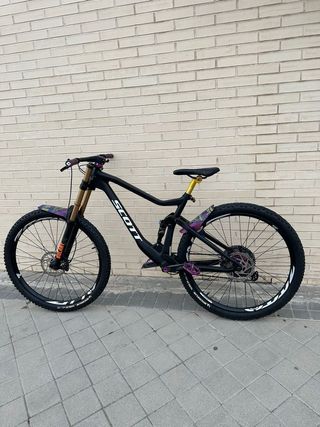 Bicicleta de montaña Scott de carbono con doble suspensión. Se puede ver y probar sin compromiso - Cuadro de carbono. - Horquilla dorada. - Manillar morado. - Pedales morados. - Ruedas Michelin Wild Enduro.
