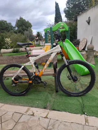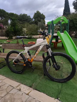 Bicicleta de montaña con doble suspensión y ruedas de 26 pulgadas. Mejoras: -Horquilla nanlio de aire 140 mm. Prácticamente nueva - grupo Shimano SLX 1x10 -Frenos sobredimensionados -Manillar doble altura -Potencia allmountain -Cadena Shimano prácticamente nueva