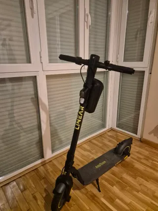 Patinete eléctrico EcoXtrem Linear en color negro. Con su cargador original. - Diseño moderno y deportivo. - Manillar con agarres texturizados. - Plataforma antideslizante. - Bolsa de transporte frontal.
