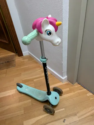 Patinete infantil con diseño de unicornio, ideal para los más pequeños. Se encuentra en buen estado. - Tres ruedas para mayor estabilidad. - Manillar ajustable en altura. - Plataforma antideslizante.