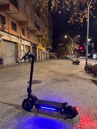 Patinete eléctrico con un diseño moderno y luces LED integradas. Esta nuevo tiene menos de 80km, El patinete corre a 25kh pero si lo quieres deslimitar esta bajo tu responsabilidad - Luces LED azules en la base. - Luz trasera roja. - Manillar ajustable. - Con intermitentes - Base alta