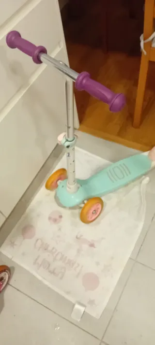 Patinete infantil de tres ruedas, util. Se quedo pequeño Manejable - Color menta y naranja. - Ruedas naranjas con detalles rosas. - Manillar ajustable.