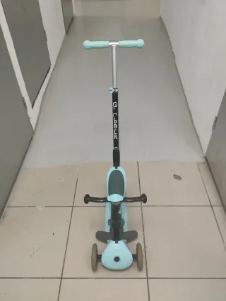 Patinete de tres ruedas en color verde, casi nuevo. - Plataforma antideslizante con diseño. - Ruedas delanteras dobles para mayor estabilidad. - Manillar ajustable en altura. Gira y es plegable