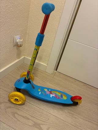 Patinete infantil con diseño de Peppa Pig. - Color azul. - Tres ruedas para mayor estabilidad. - Manillar ajustable con puños de goma. - Decoración colorida con Peppa Pig y arcoíris.
