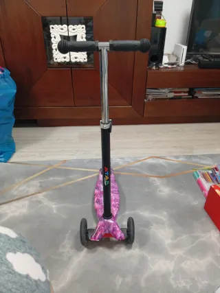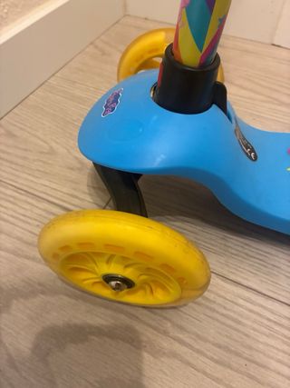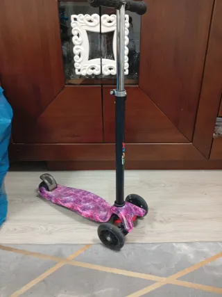 Patinete infantil Globber de tres ruedas en color rosa. Ideal para los más pequeños. - Manillar ajustable en altura. - Ruedas con luces. - Plataforma antideslizante. El patinete esta en perfectas condiciones y funciona super bien, aunque si se nota el uso del mismo. Comprado nuevo hace 2 años.