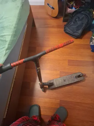 Patinete eléctrico con un diseño moderno en negro y detalles rojos. - Manillar con puños negros. - Plataforma con diseño deportivo. - Ruedas visibles. Nuevo tiene 2 meses de uso mi hijo lo lo usa enciende pero no va nose k puede ser de hay su precio es eletrico
