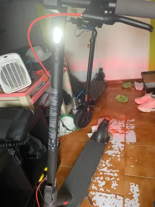 Patinete eléctrico con manillar y luces frontales. - Manillar negro con puños texturizados. - Luces LED frontales. - Rueda delantera pequeña. Patinete Xiaomi pro 2 modificado, tiene llave para encender, tiene motor delantero skate flash, tiene frenos hidráulicos, recién cambiada la rueda trasera, el patinete está limitado a 25, tiene una autonomía de unos 20 km pasando 80kilos tiene manillar de bici, suspensión monorím , el patinete está bastante bien, para terminar el proyecto ,NO NEGOCIABLE