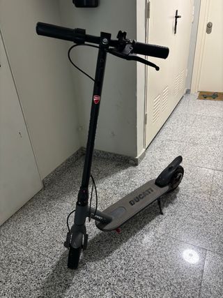 Patinete eléctrico de la marca Ducati, modelo PRO. Diseñado para desplazamientos urbanos. - Color negro. - Logo de Ducati en el manillar. - Plataforma con el nombre de la marca. -Ruedas sin hinchar - En la parte de la pantalla tiene algun harañazo