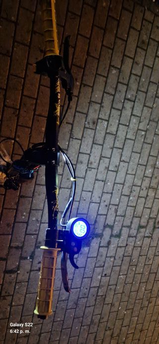 Patinete eléctrico con modificaciones - Manillar amarillo. - batería externa que hace que le dure mucho más la batería