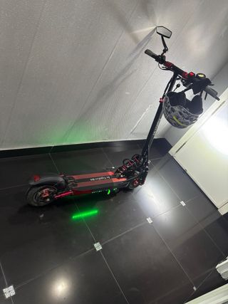 Patinete eléctrico Kugoo Kirin M4 en color negro y rojo. Cuenta con luces LED verdes. 1 modo 21 por hora 2 modo 38 por hora 3 modo 55 por hora - Manillar ajustable. - Espejos retrovisores. - le falta una bateria ya que tiene 3 modos y en el tercer modo si le aceleras se apagara al instante
