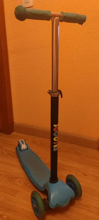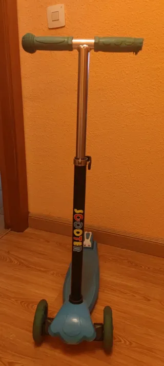 Patinete de tres ruedas en color azul, ideal para los más pequeños. Diseñado para ofrecer estabilidad y diversión. - Manillar con puños de goma. - Plataforma antideslizante. - Ruedas de color verde.