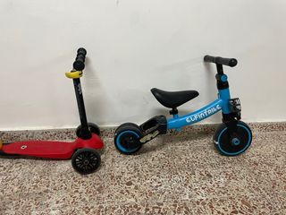 Pack de dos vehículos para niños: una bicicleta de aprendizaje sin pedales y un patinete. - Bicicleta de aprendizaje azul con manillar negro. - Patinete rojo con tres ruedas y manillar negro.