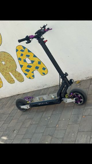 Patinete eléctrico Kukirin G2 Master con modificaciones. frenos 4 pistones manillar de carbono suspensiones rebajadas base diseñada 1500km discos de freno 180mm - Manillar y puños en color morado. - Detalles en color morado en las ruedas y suspensión. - Plataforma con adhesivos. - Marca Kukirin visible en el lateral