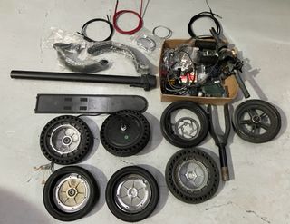 Conjunto de piezas de repuesto para patinete Xiaomi. - Manillar - Tapa de batería - Ruedas (varias) - Frenos - Cables - Caja con componentes electrónicos y accesorios Algunas piezas son nuevas, otras no lo son pero funcionan, y otras necesitan reparación. El precio es por todo.
