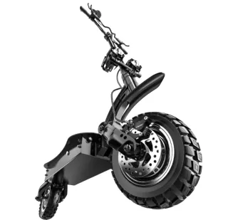 Patinete eléctrico de color negro con un diseño robusto y moderno. - Plataforma con superficie antideslizante. - Ruedas todoterreno. - Manillar ajustable. - Freno de disco. -bateria 52 .40000 mah -centralitas jp