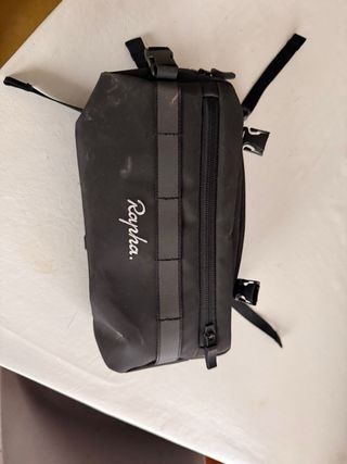 Bolsa negra para manillar de bicicleta de la marca Rapha. Diseño compacto y funcional. - Cierre de cremallera. - Correas de sujeción ajustables. - Logo de Rapha en blanco.