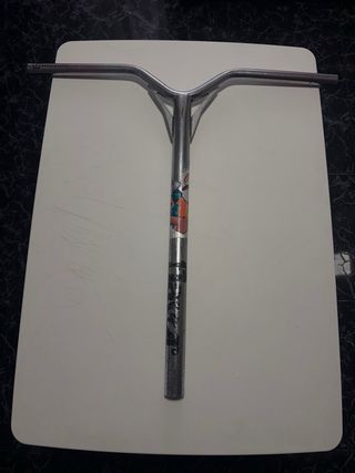 Manillar de aluminio para patinete. - Diseño en forma de Y. - Acabado plateado. - Incluye pegatinas decorativas. - Marca flavor - No tiene ninguna fisura está en muy buen estado pa darle caña !!