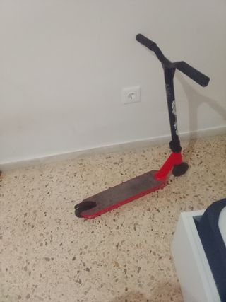 Patín scooter de tres ruedas con diseño deportivo en color rojo y negro. Ideal para deslizarse y divertirse. Hace derrapes. Le falta el cable del freno, de ahí el precio. - Tres ruedas para mayor estabilidad. - Plataformas para los pies. - Manillar ajustable.
