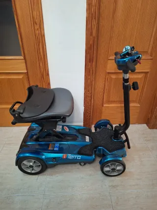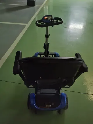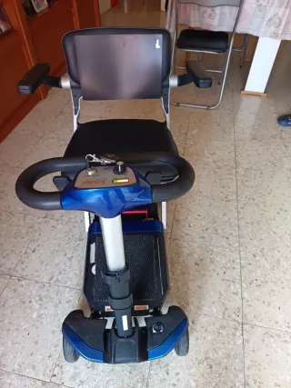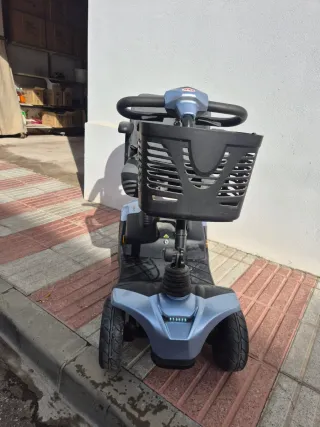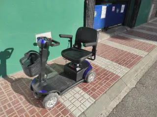 Scooter de movilidad reducida en color azul, en muy buen estado. - Asiento acolchado. - Reposabrazos abatibles. - Manillar ajustable. - Ruedas neumáticas.
