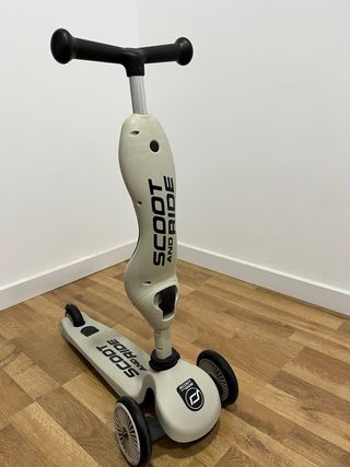 Patinete 2 en 1 que se convierte en bicicleta de equilibrio. - Diseño en color blanco y negro. - Ruedas para patinar y asiento para pedalear. - Manillar ajustable en altura. - Tiene un pequeño rasguño en el manillar (ver foto)