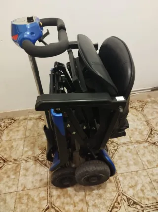 Silla de movilidad reducida automática en color azul. Diseñada para facilitar el desplazamiento. - Asiento cómodo y ergonómico. - Reposabrazos abatibles. - Manillar ajustable. - Ruedas todoterreno Plegado automático solo accionando un botón. Usada durante cinco meses