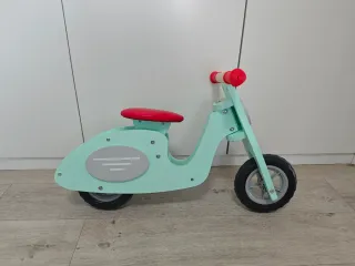 Bicicleta de equilibrio de madera en color menta y asiento rojo. - Diseño inspirado en una scooter. - Ruedas negras con llantas grises. - Puños de manillar en rojo y blanco.