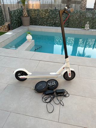 Patinete eléctrico Xiaomi Mi Scooter 365 en color blanco. Incluye dos ruedas de repuesto y dos cargadores. - Diseño plegable. - Ruedas de goma. - Manillar ajustable. Incluye dos ruedas de repuesto y dos cargadores originales