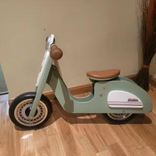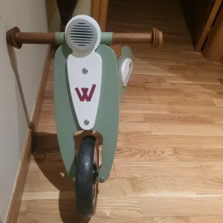 Moto de equilibrio de madera para niños. Ideal para niños 1 a 3 años - Diseño inspirado en una scooter. - Manillar con puños de goma. - Rueda delantera negra.