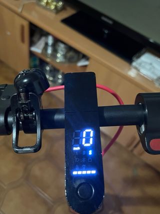 Patinete eléctrico Xiaomi. - Manillar con timbre. - Pantalla con indicadores LED. - Botón de encendido. Las dos ruedas son macizas Lo único que no tiene el guardabarros de atrás.