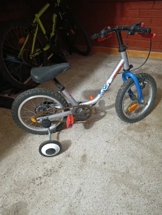 Bicicleta plateada para niños con detalles en azul y rojo. - Ruedines incluidos para facilitar el aprendizaje. - Diseño divertido con dibujos. - Frenos en manillar y pedal.