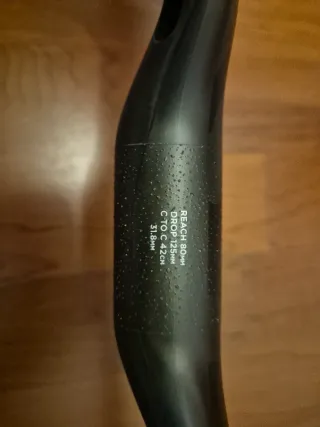 Manillar de carretera OC RP11 fabricado en carbono. Es un modelo ultraligero. Se ha quitado sin usar de una Orbea m30i ltd, para poner uno integrado. Unos 190gr de peso. Con orificios para ocultar cables. Reach 80mm Drop 125mm Longitud 420mm Diámetro 31'8mm